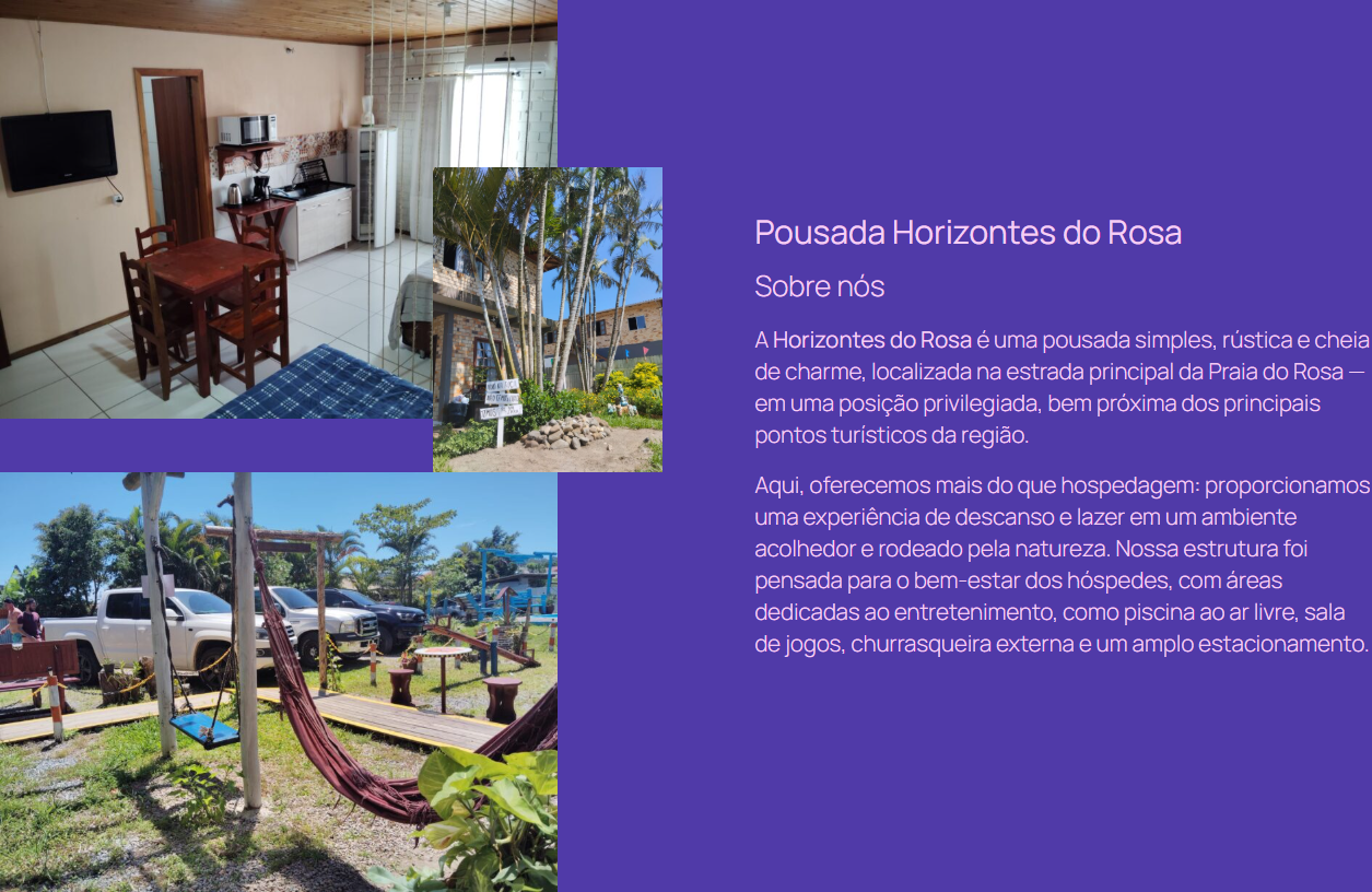 A marca Horizontes nasceu em 2018, na charmosa cidade de Balneário Camboriú. Desde então, seguimos construindo uma trajetória de acolhimento e conexão com a natureza. Em 2022, esse sonho se expandiu até a Praia do Rosa, onde nasceu a Pousada Horizontes do Rosa.